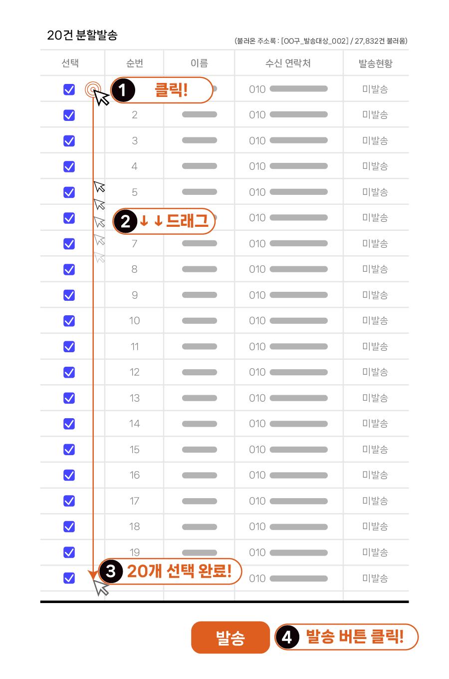 공직선거법에 따라 한 번에 20명의 수신자에게만 동시 발송이 가능한 문자 발송 방식